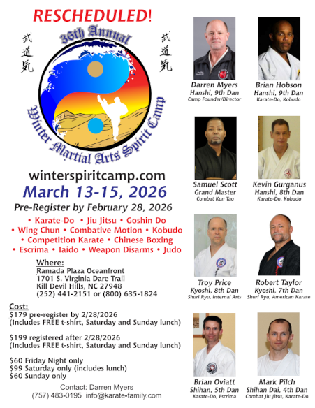 Rescheduled due to weather.... This will mark the 36th year that the Winter Martial Arts Spirit Camp has been held on the beautiful Outer Banks of North Carolina.